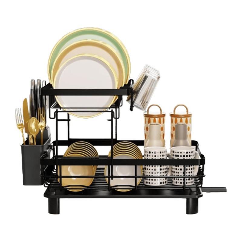 Escorredor de pratos escorredor de pratos escorredor de pratos sobre a pia escorredor com bandeja coletora 2 camadas com suporte de talheres resistente à ferrugem economia de espaço aço inoxidável