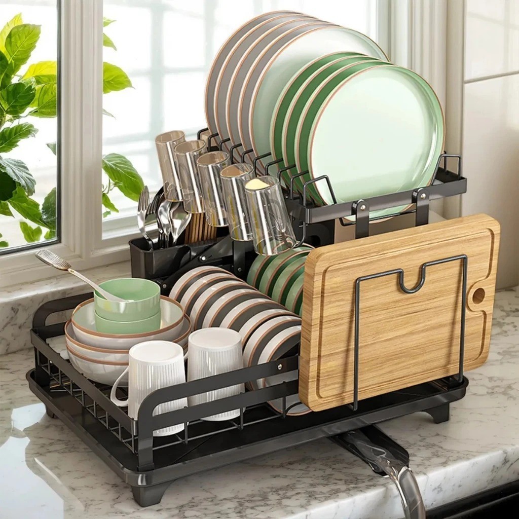 Escorredor de Pia de Louças Aço Inox Cromado Com Suporte de Talher e Copos 2 Andares Porta Talheres
