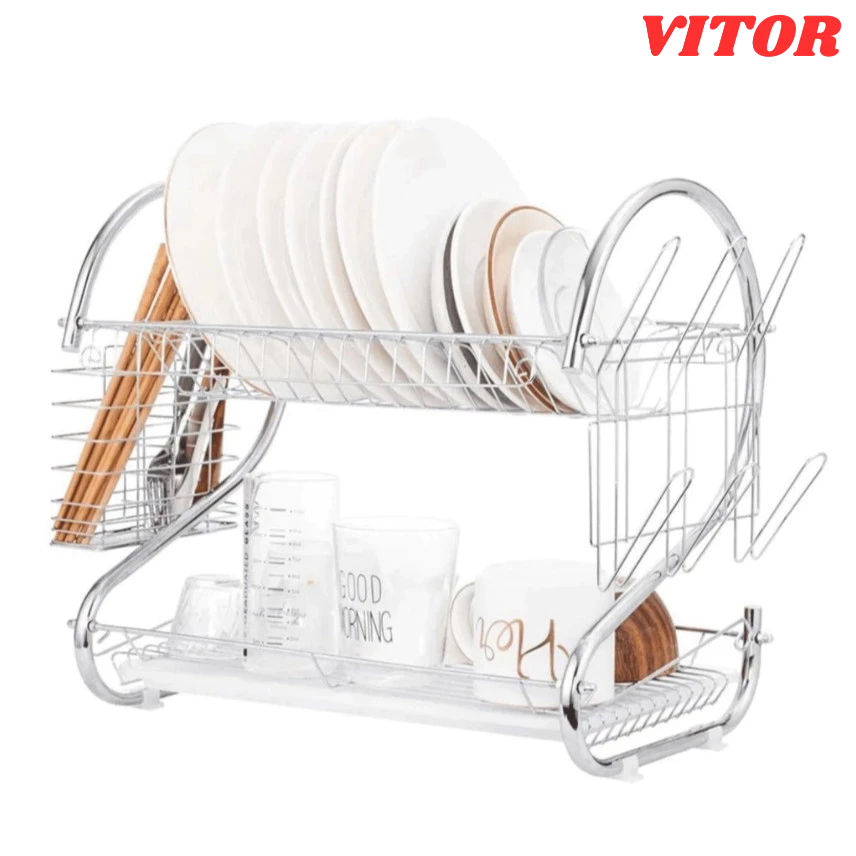 Escorredor 2 Andares de Aço Inox com Bandeja Coletora Porta Pratos Copos Talheres VITOR