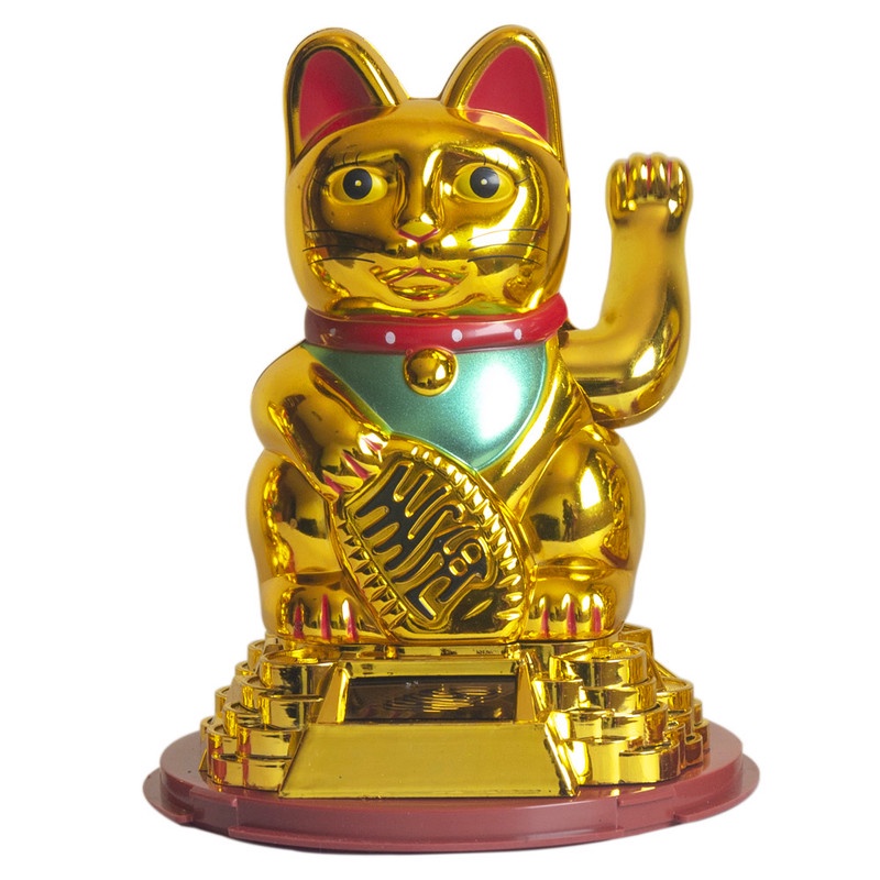 Gato da Sorte Dourado Maneki Neko Balança Mão Carrega Solar