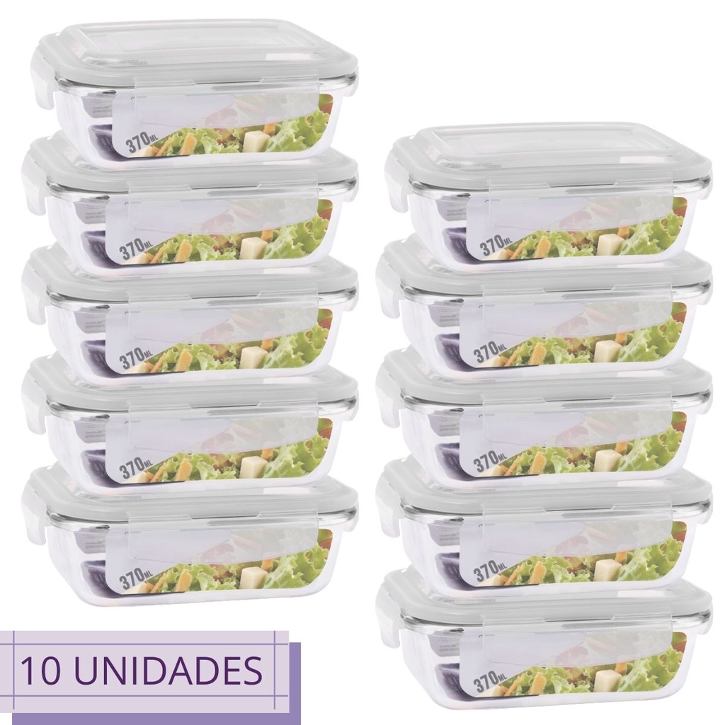 Jogo 10 Potes de Vidro 370 ml Hermético Marmita Fit com Tampa 4 Travas
