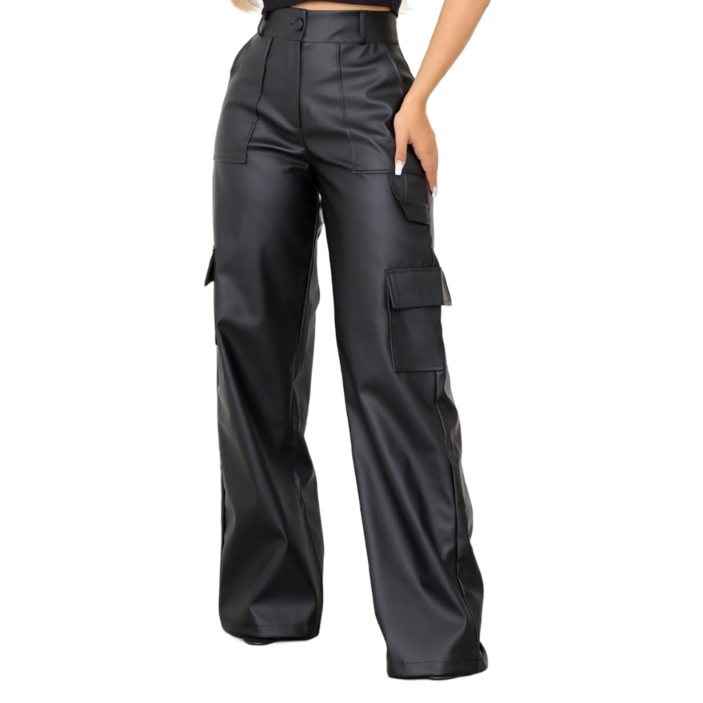 Calça Pantalona Wide Leg Reta Cargo Couro Fake Cintura Alta Moda Gringa Bolso Lateral