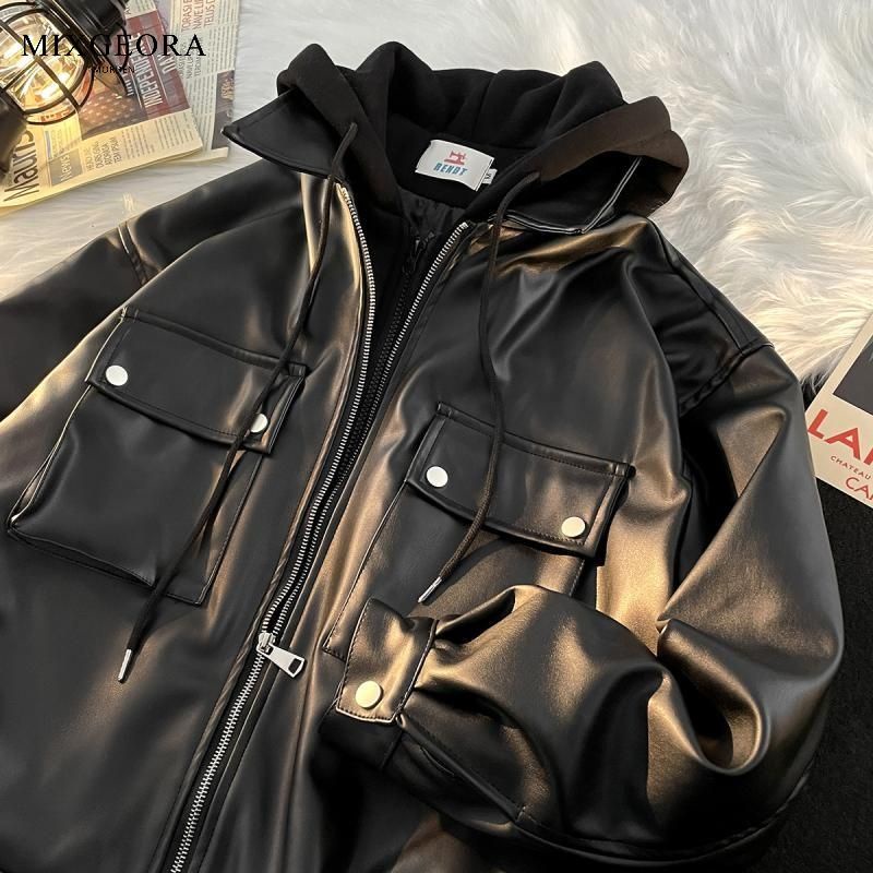 Jaqueta de Couro Americana Retro Falsa de Duas Peças com Capuz Falso para Homens com Mola de Outono Solta com Ferramentas da Tendência PU
