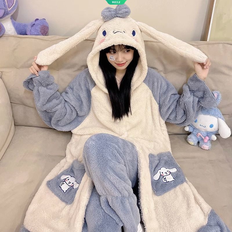 Sanrio Cinnamoroll Roupa De Dormir Feminina 2024 Inverno Novo Veludo Coral Acolchoado Espessado Lazer Quente Moda Com Capuz + Calça Fato De Duas Peças Para Casa