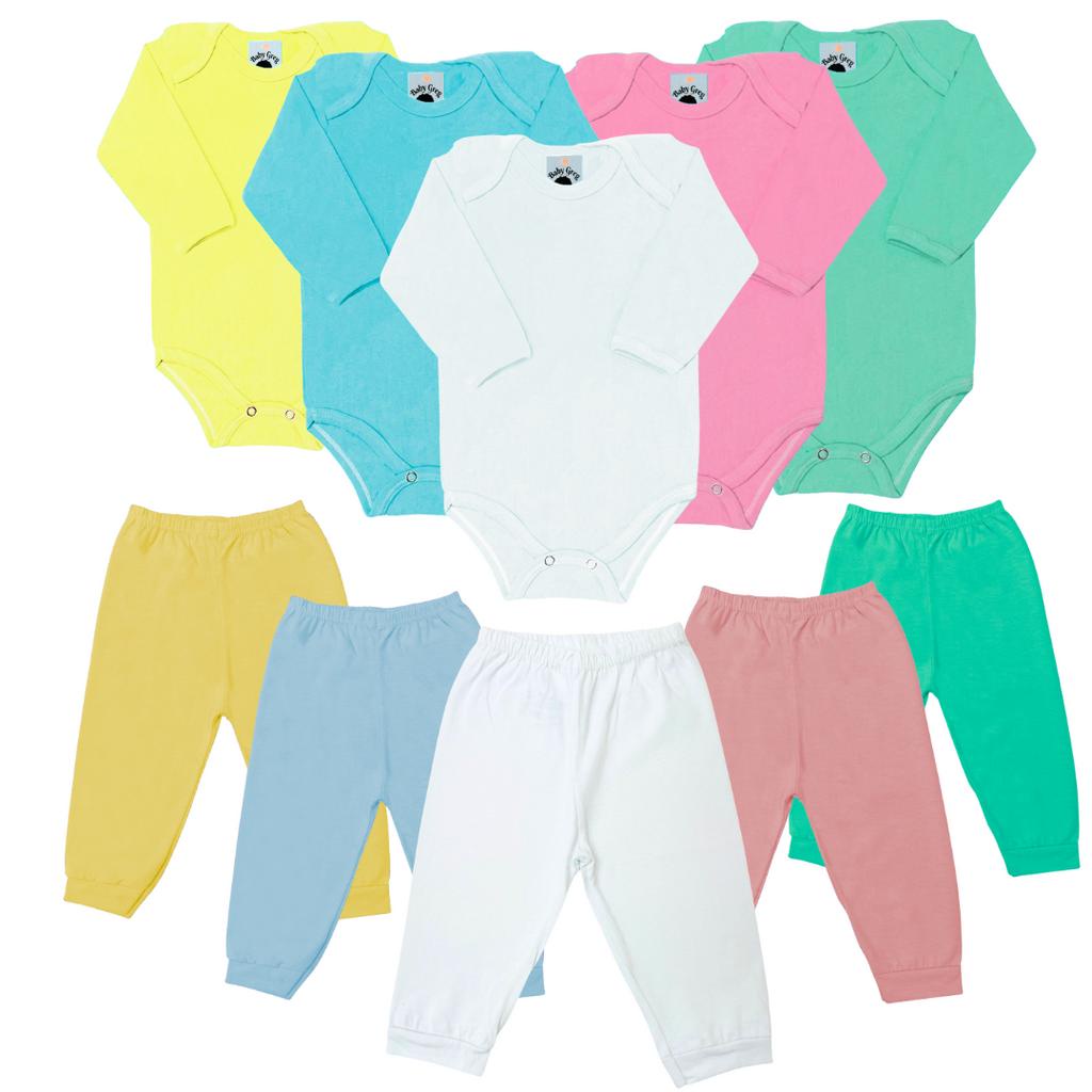 Kit 10 Roupinhas De Bebê (5 Body Manga Longa Suedine + 5 Mijões/Calça Malha) 100% Algodão