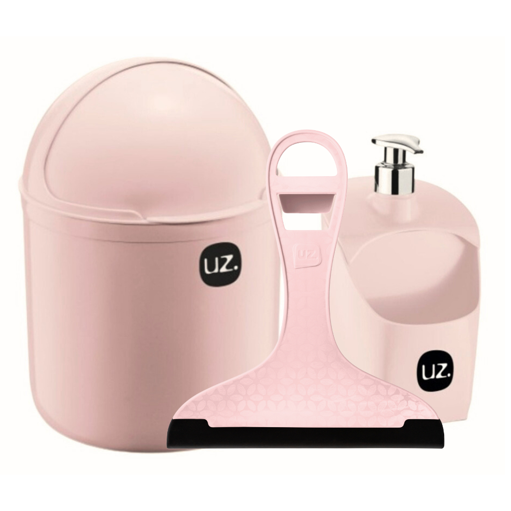 Kit de Cozinha 3 Peças Rosa Rodinho de Pia Dispenser e Lixo 4 Litros