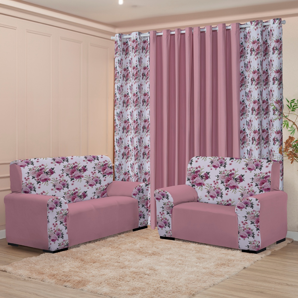 Kit Decoração Sala, Cortina + kit 2 e 3 Lugares Coladinha Mista Floral Estampada Sala Capa de Sofá Protetor
