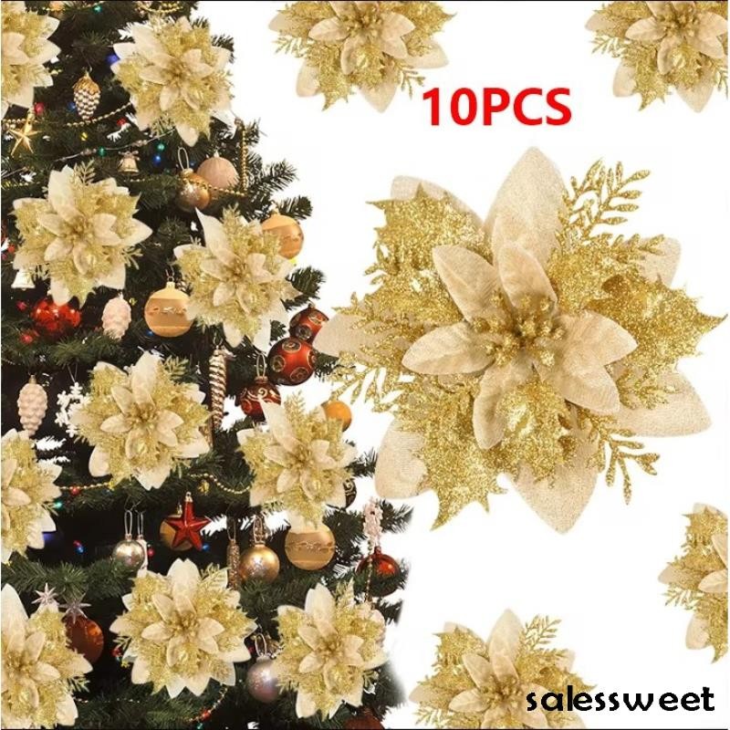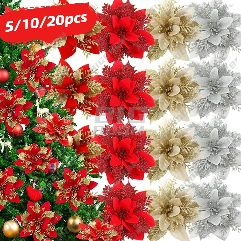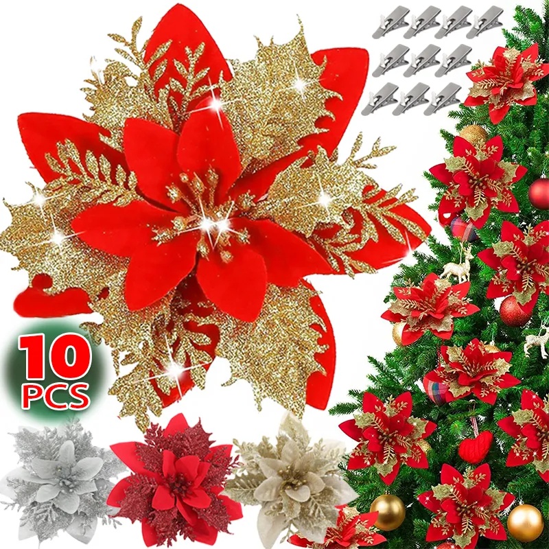 5/10Pcs Flores De Natal Artificiais Glitter Falsas Feliz Decorações Árvore Ornamentos Ano Novo
