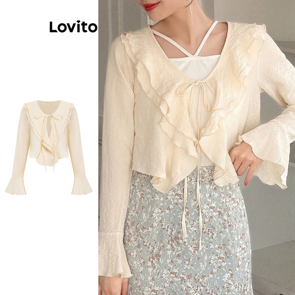 Lovito Blusa feminina fofa com babados lisos e bainha com laço e laço L88AD175