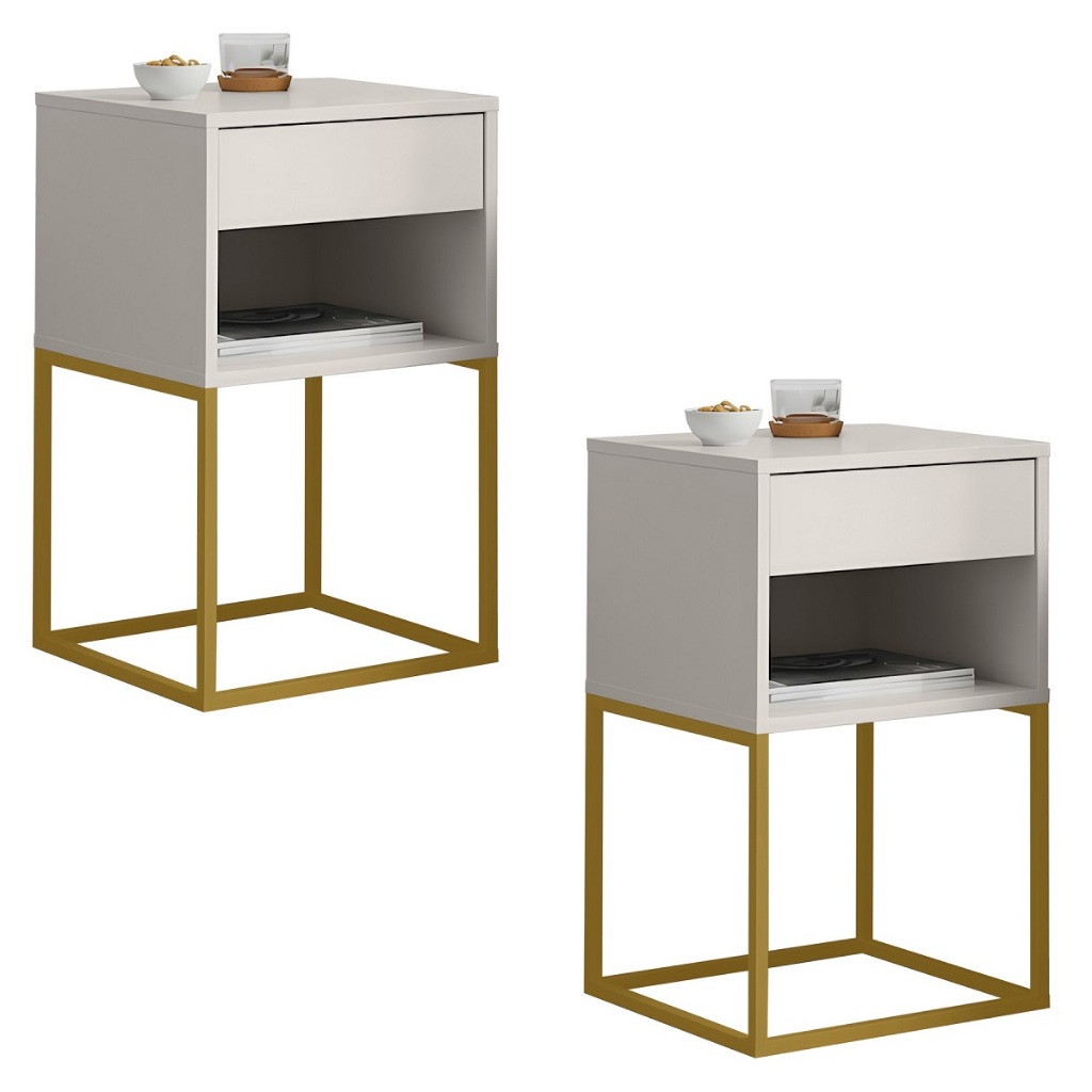 Kit 2 Mesa Cabeceira Industrial Com Pés de Ferro Dourado 2 Gavetas Puxador Cava Cor Off white