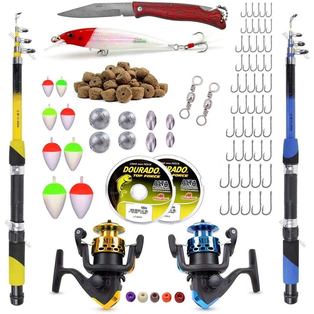 Kit De Pesca Completo 10kg C/ 2 Varas 2 Molinetes Estojo Sambura Canivete mais itens