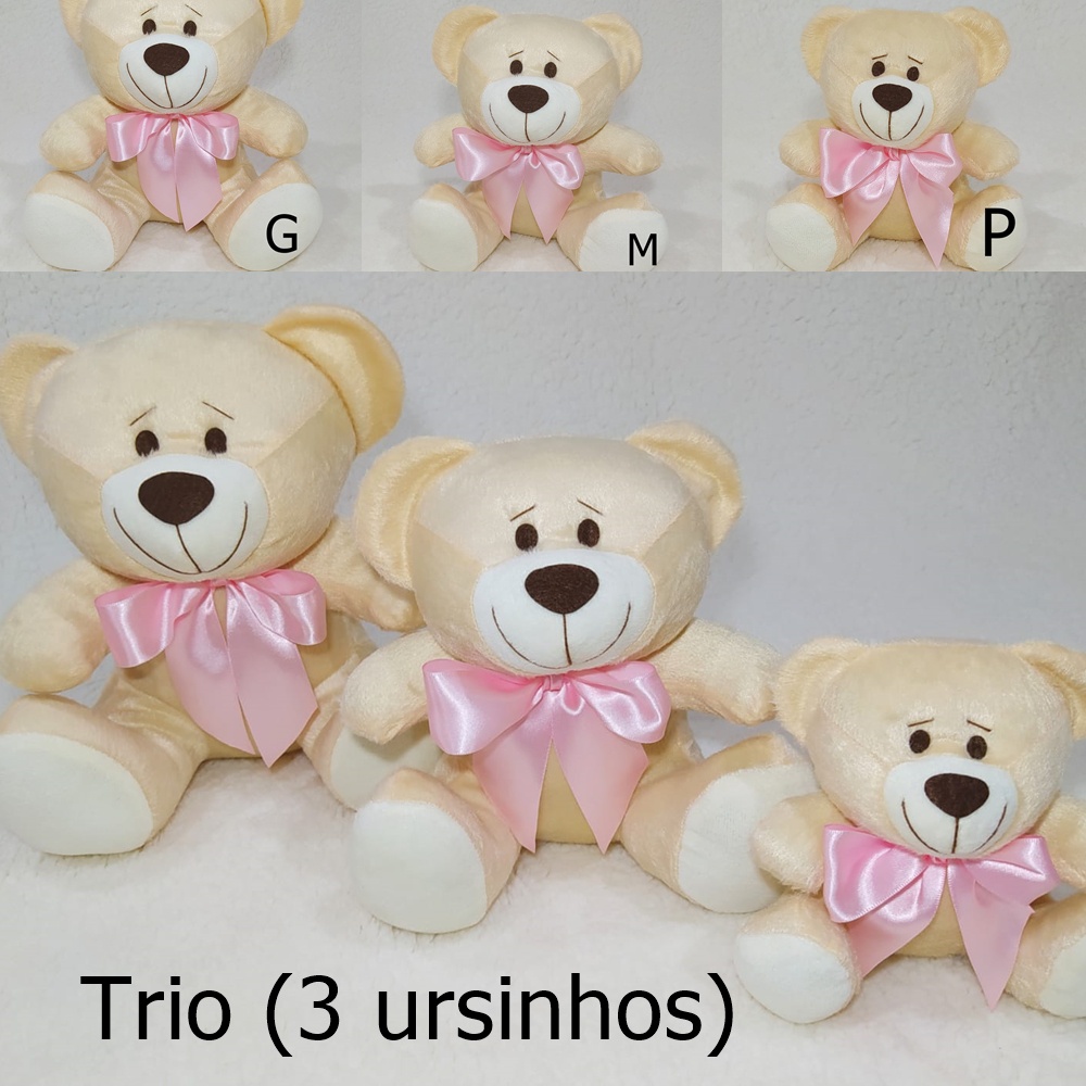 Urso Avulso e Trio De Ursinhos Com Laço Rosa Cetim P/ Nichos 14cm 20cm 25cm