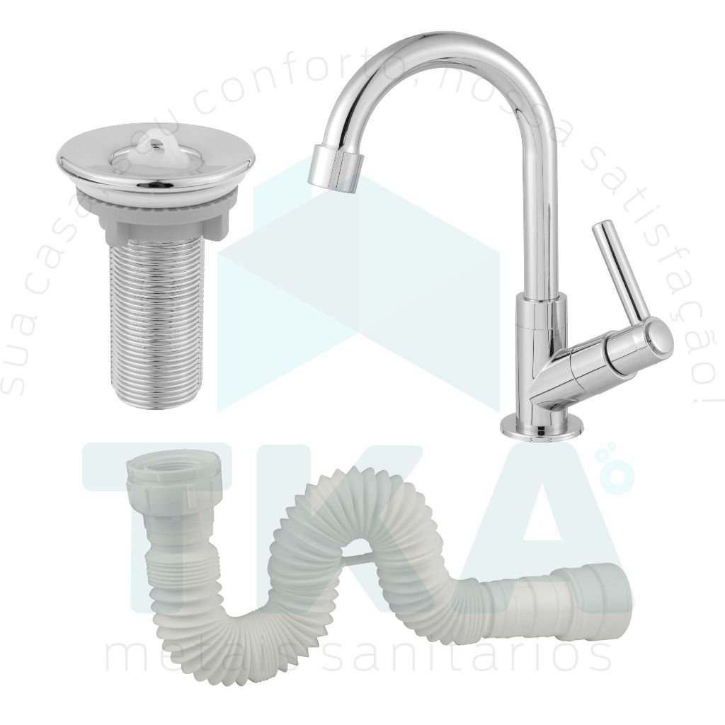 Kit Para Cuba Lavatório Torneira Pia de Banheiro Cromado ABS + Valvula 7/8 Cromada + Sifão Branco