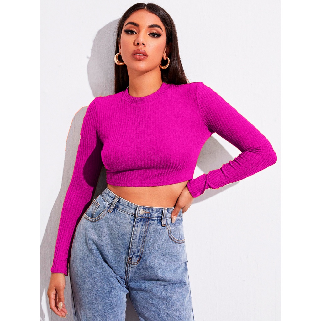cropped manga longa gola alta vazado canelado blogueira instagram