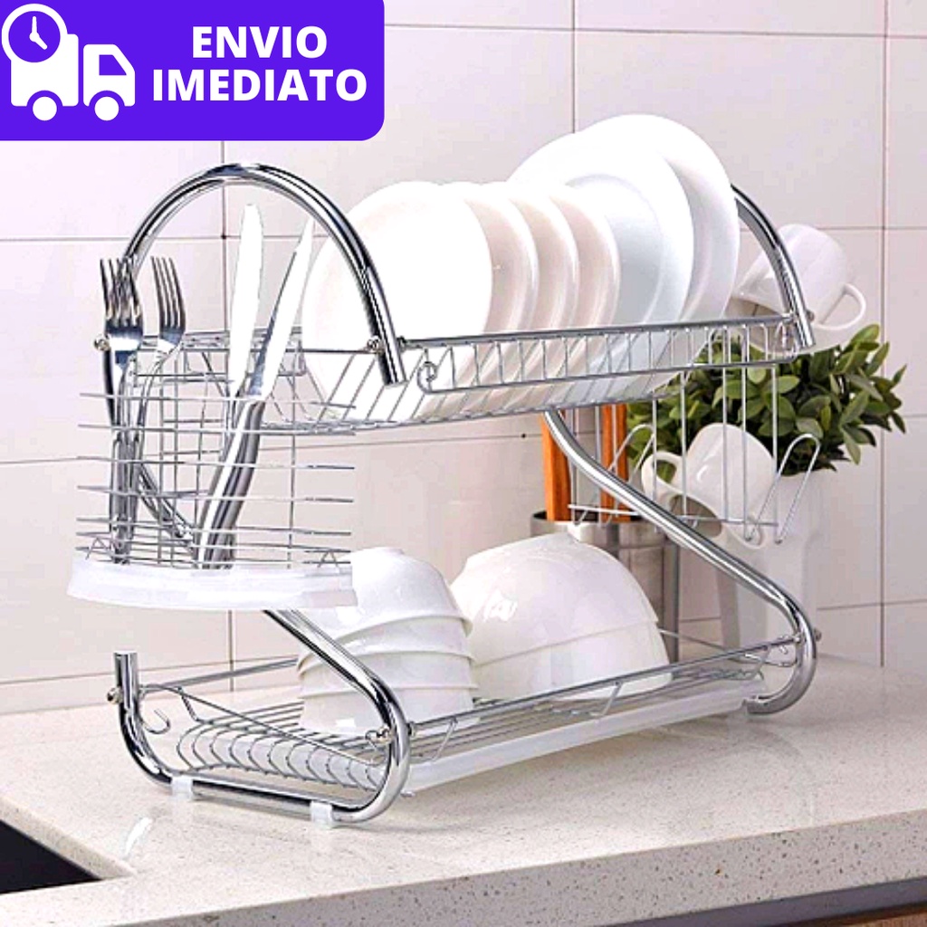 Escorredor de Louça Duplo Para 14 Pratos 6 Copos Talheres Aço Cromado