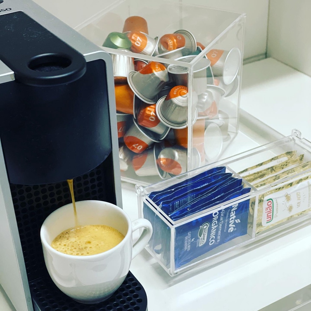 Kit Cantinho do café Caixa Acrílico porta Cápsulas + Organizador Sachês De Açúcar E Adoçante Com Tampa Articulada