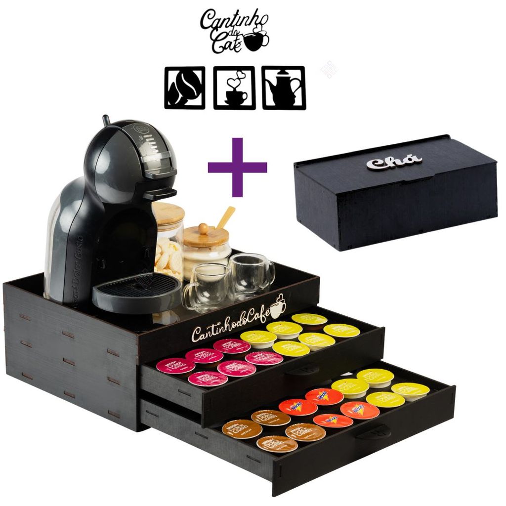 Kit Cantinho do Café MDF com Bandeja Porta 48 Cápsulas e Caixa de Chá Premium Completo Apoio Luxo