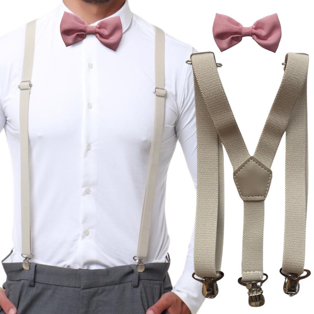 Suspensório Bege e Gravata Borboleta Rosê Adulto Sofisticado Noivo Padrinho