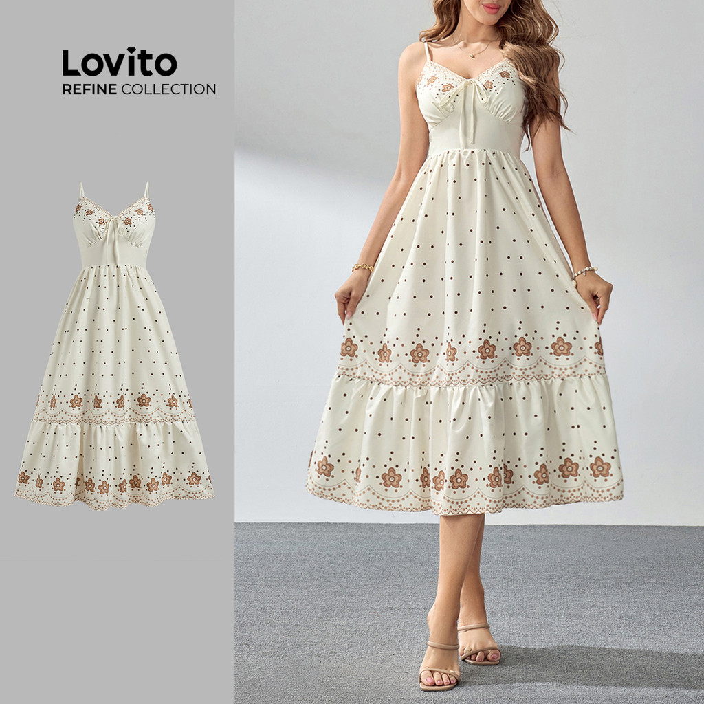 (Lovito Refine) Vestido Boho Floral Lace Up Estrutura Linha para Mulheres LR2LD067