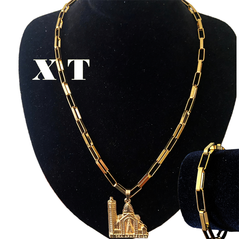 Kit Corrente e Pulseira cadeia oca Masculina Banhada 18k 60/70cm com pingente de igreja nossa senhora