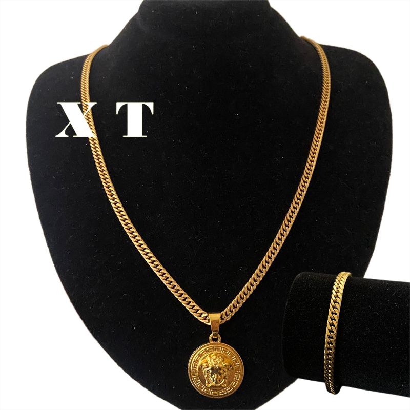 Kit Corrente Masculina e Pulseira Elo Duplo Grumet banhado Com Pingente de Medusa