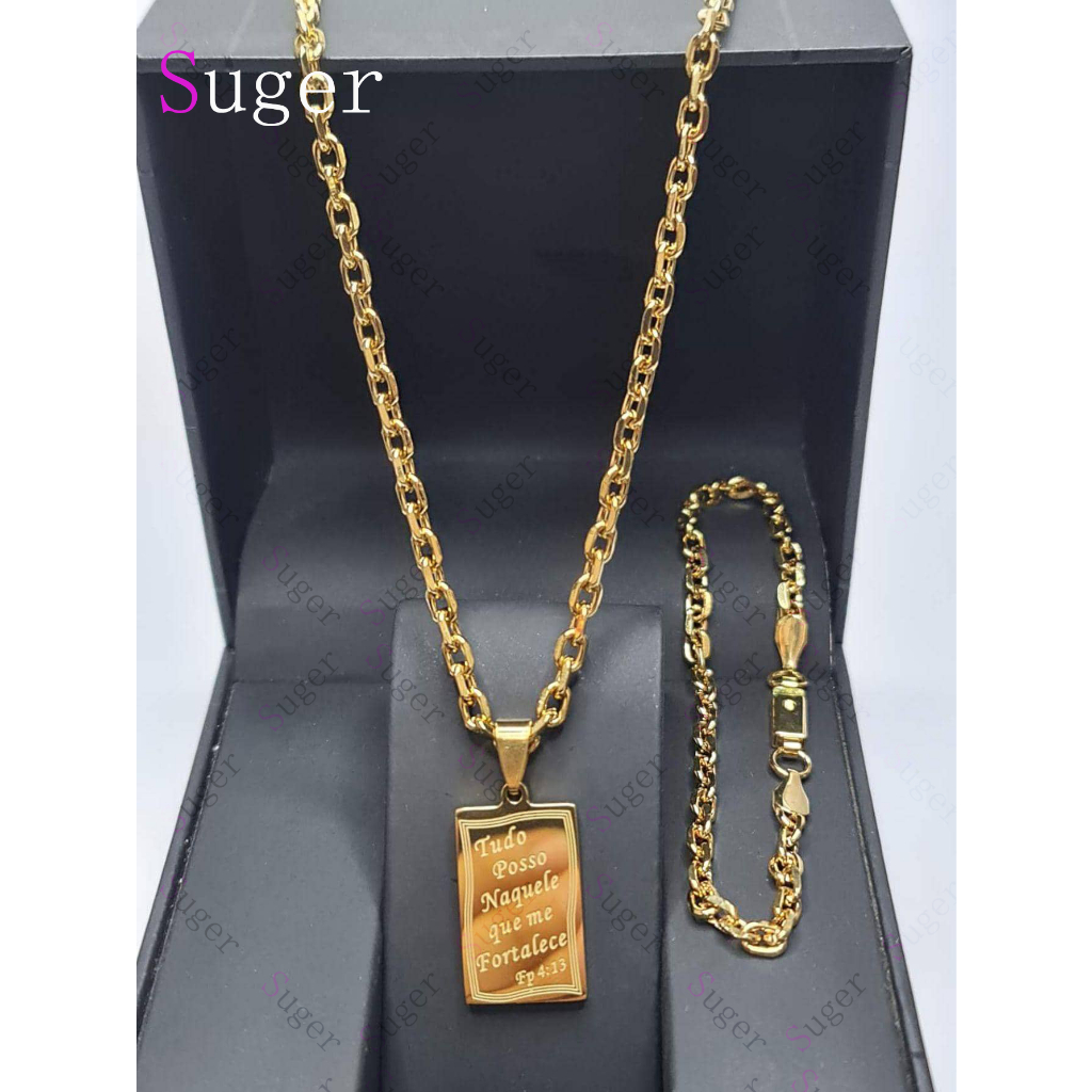 kit Corrente e Pulseira Masculina Gominho 4mm x 60cm Pingente de Tudo Posso Naquele Que Me Fortalece Dourado Aço inoxidável 316L