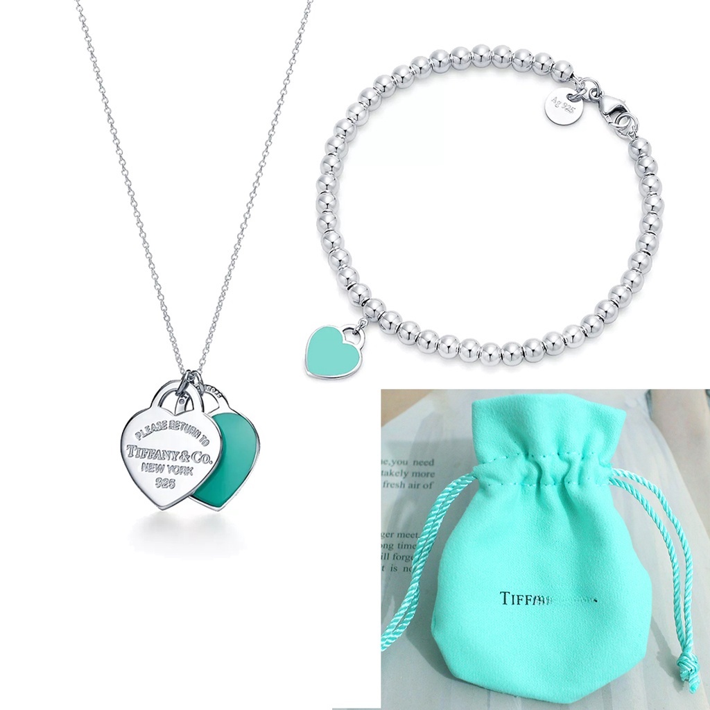 Kit Conjunto Colar E Pulseira Bracelete T&Co Azul Corrente Coração Prata 925 Bracelete Com Saco de veludo