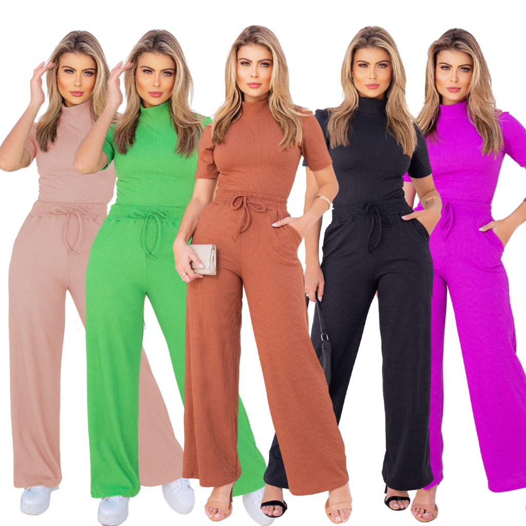 Conjunto Feminino Calça Pantalona E Blusa Gola Alta Wide Leg / Canelado Premium com Toque de Algodão