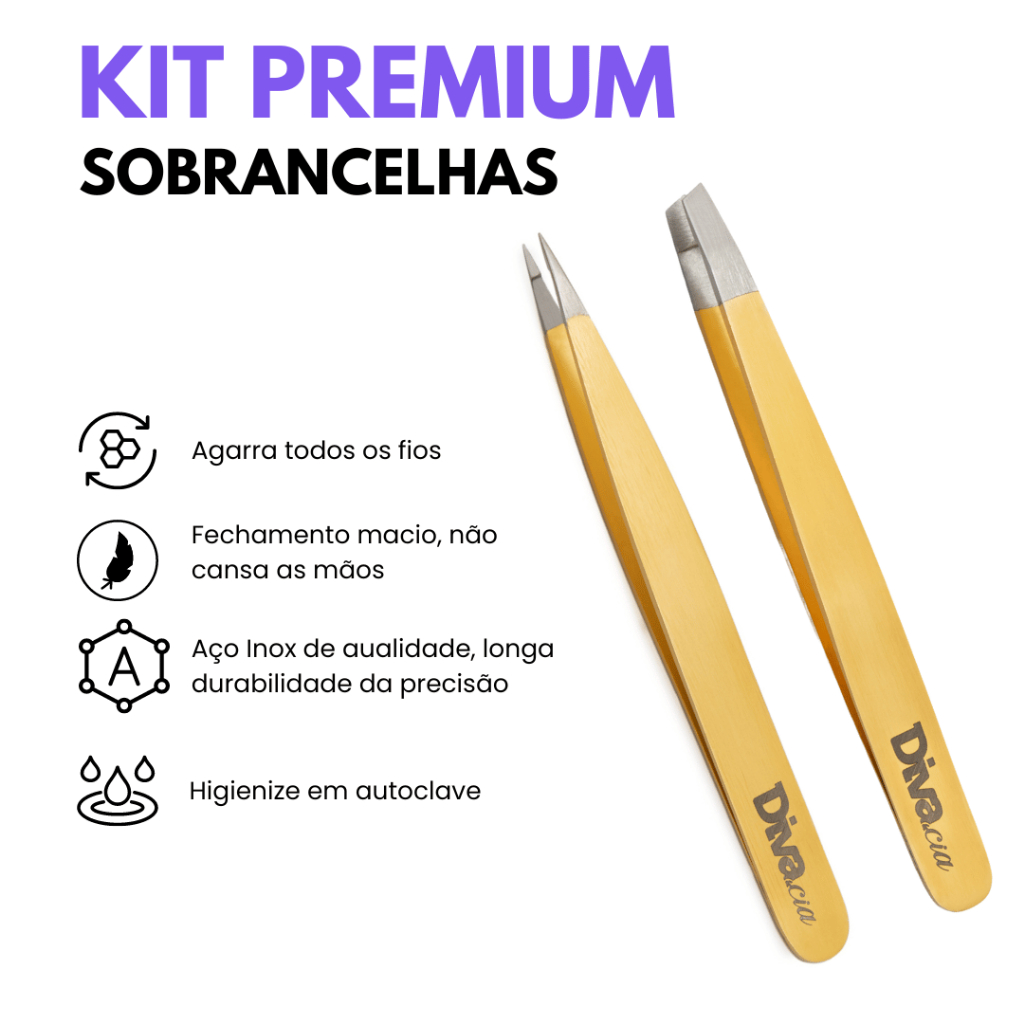 Kit Pinças Agulha e Chanfrada Design Sobrancelhas Premium Autoclavável