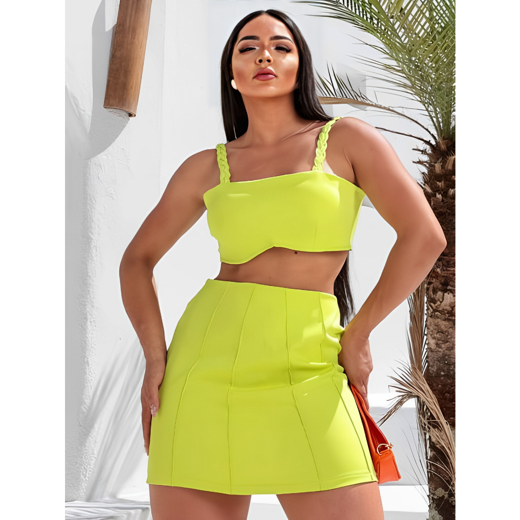 Conjunto Feminino Modal Cropped e Saia Curta Tricô Detalhes Aran