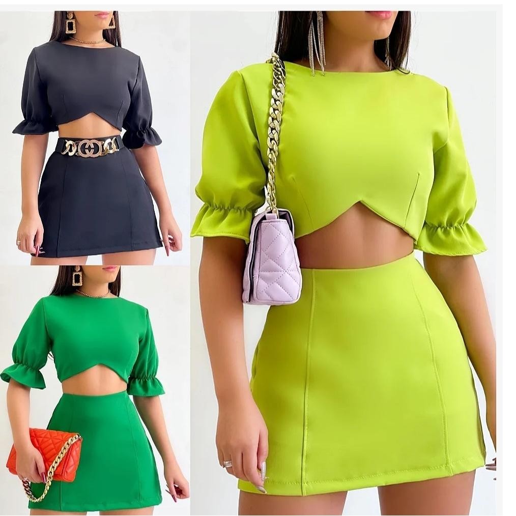 Conjunto Feminino Cropped Decote V E Saia Curta Fru Fru