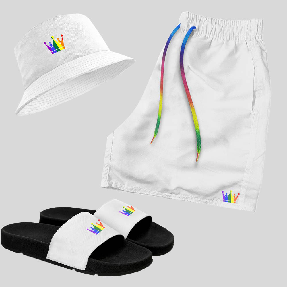 Kit Short Praia Mauricinho Masculina + Chinelo Slide + Bucket hat Coroa LGBT