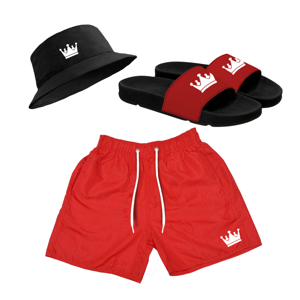 Kit Short Praia Mauricinho Masculina + Chinelo Slide + Bucket hat Coroa Rosa