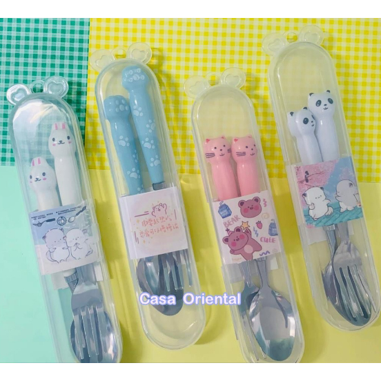 Talher Infantil e Adulto kit 4pçs Bichos sortidos p/Viagem Marmita Portátil Durável Com Estojo kit jogo de Talheres Infantil kids Colher Garfo Faca com 3 Peças em inox