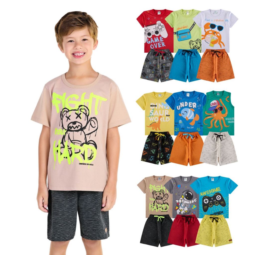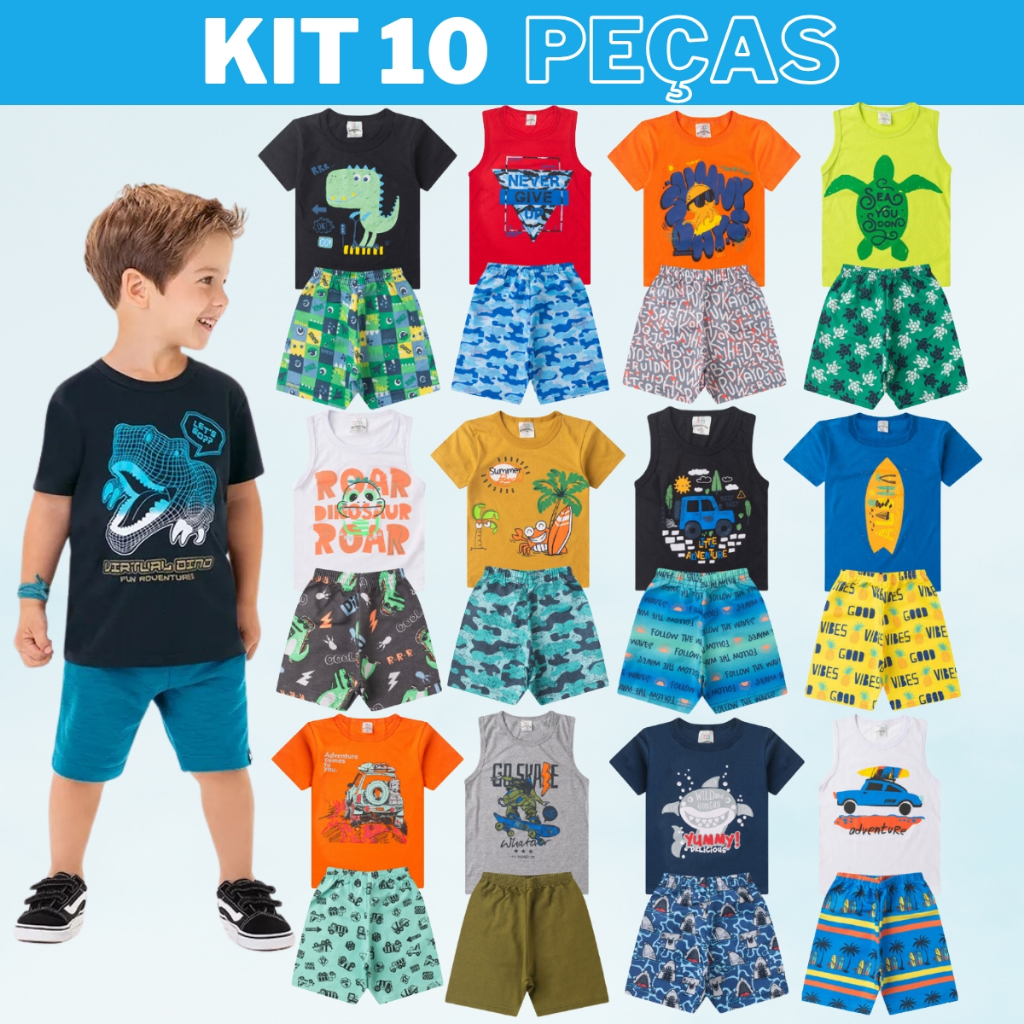 Kit Conjunto 10 Peças Sortidos de Roupas Verão Infantil Menino 5 Camisetas 5 Bermudas