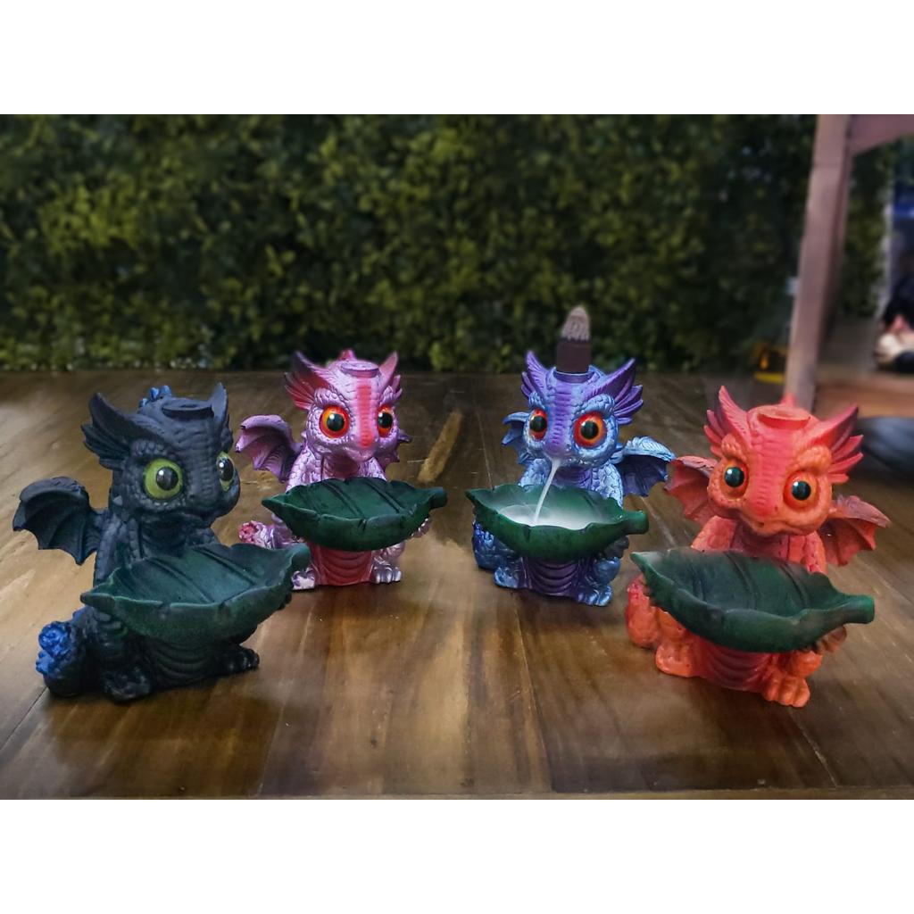 Kit 2 Incensários Dragão Baby Cascata De Fumaça Em Resina Decorado Incenso Cone
