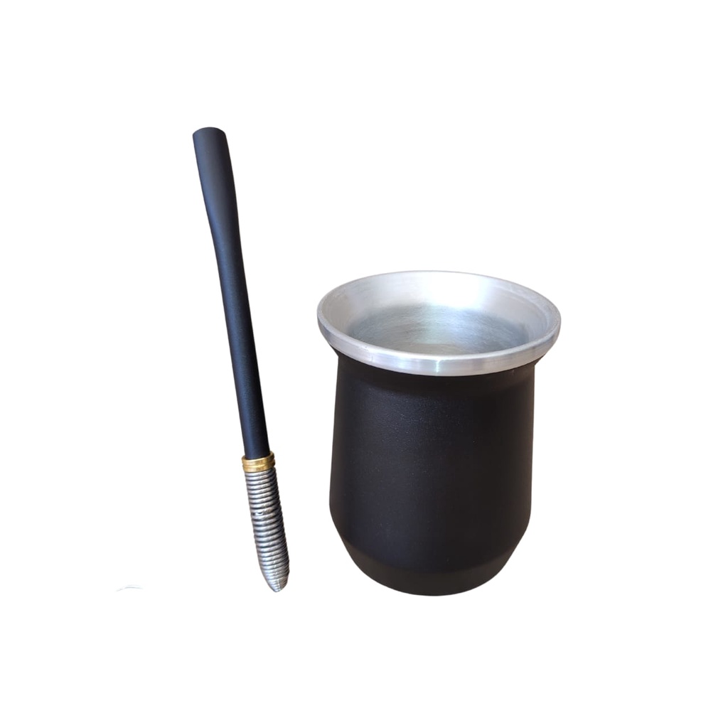 Kit Tereré 1 Copo Cuia De Alumínio Preto Fosco 300ML 1 Bomba De Inox Preta Com Mola Cônica