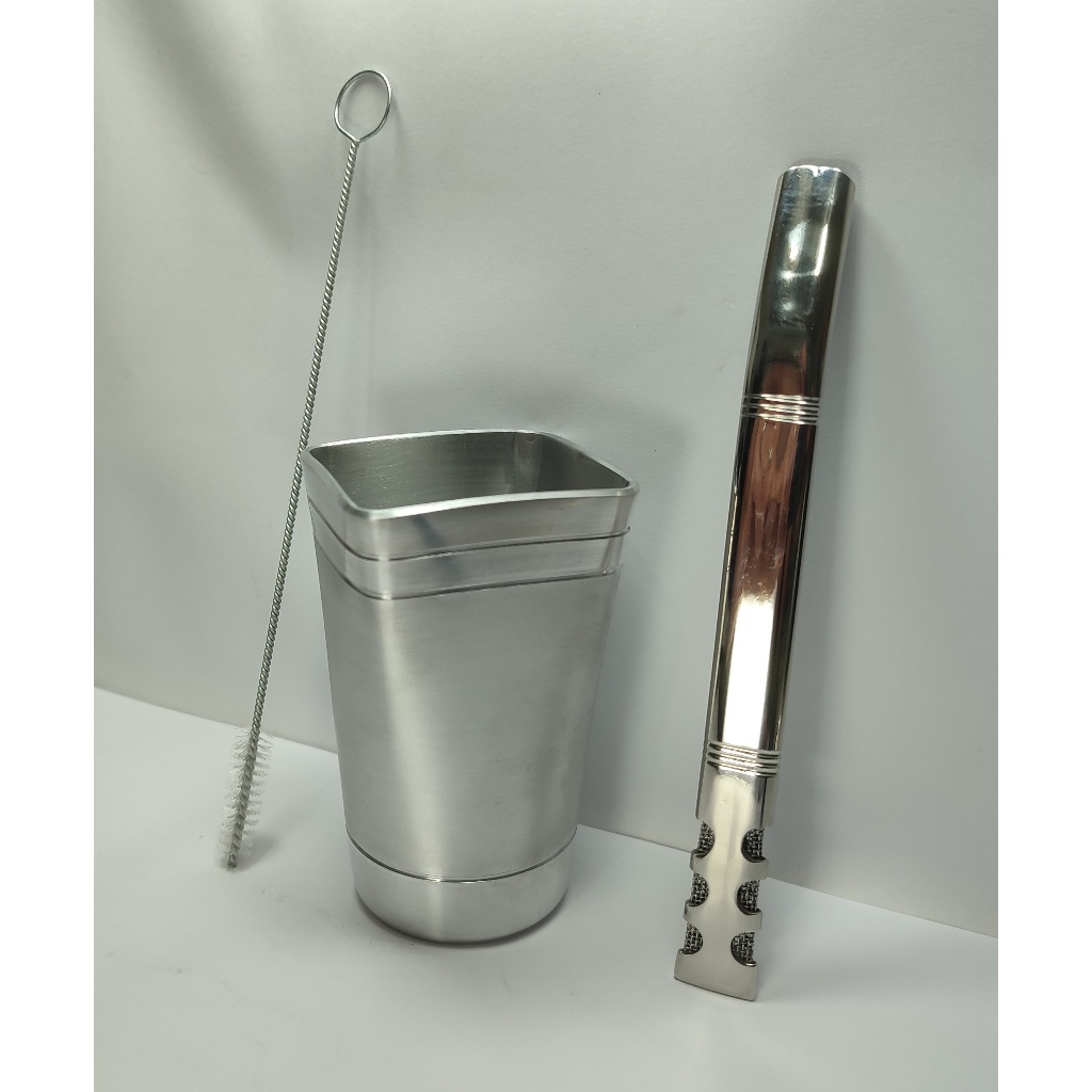 Kit para Tereré: Copo Cuia De Alumínio Boca quadrada 2MM 300ml + Bomba INOX V6 PREMIUM TELADA POLIDA e Escovinha Limpeza