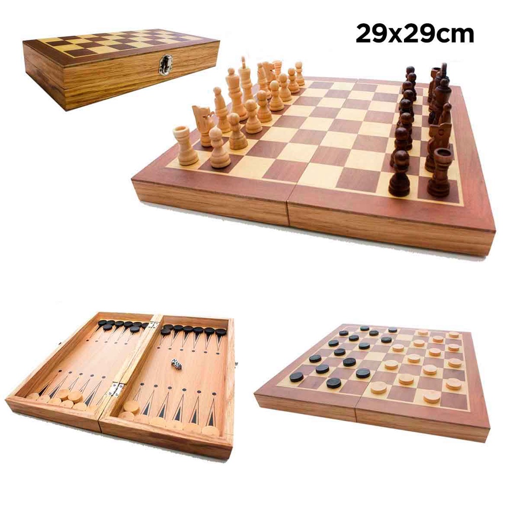 Jogo Xadrez Dama Gamão Tabuleiro Jogos 3 Em 1 29x29 Madeira
