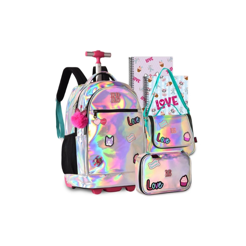 Kit Mochila Rb Rebecca Bonbon Infantil Escolar Carrinho Rodinha Lancheira e Estojo Holográfica