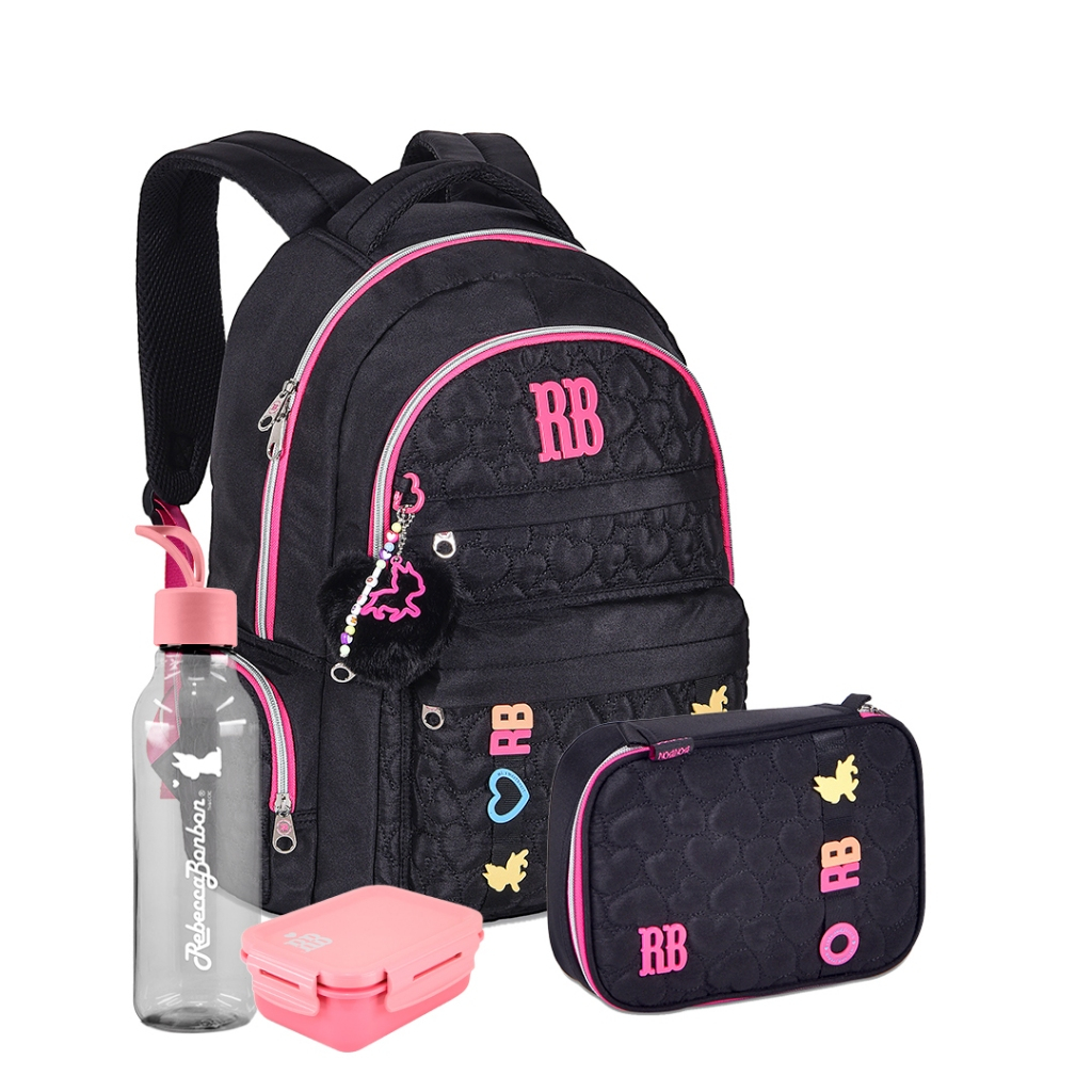 Kit Escolar Mochila Feminina Rebecca Bonbon Costa Preta com Lancheira Térmica e Estojo - RB