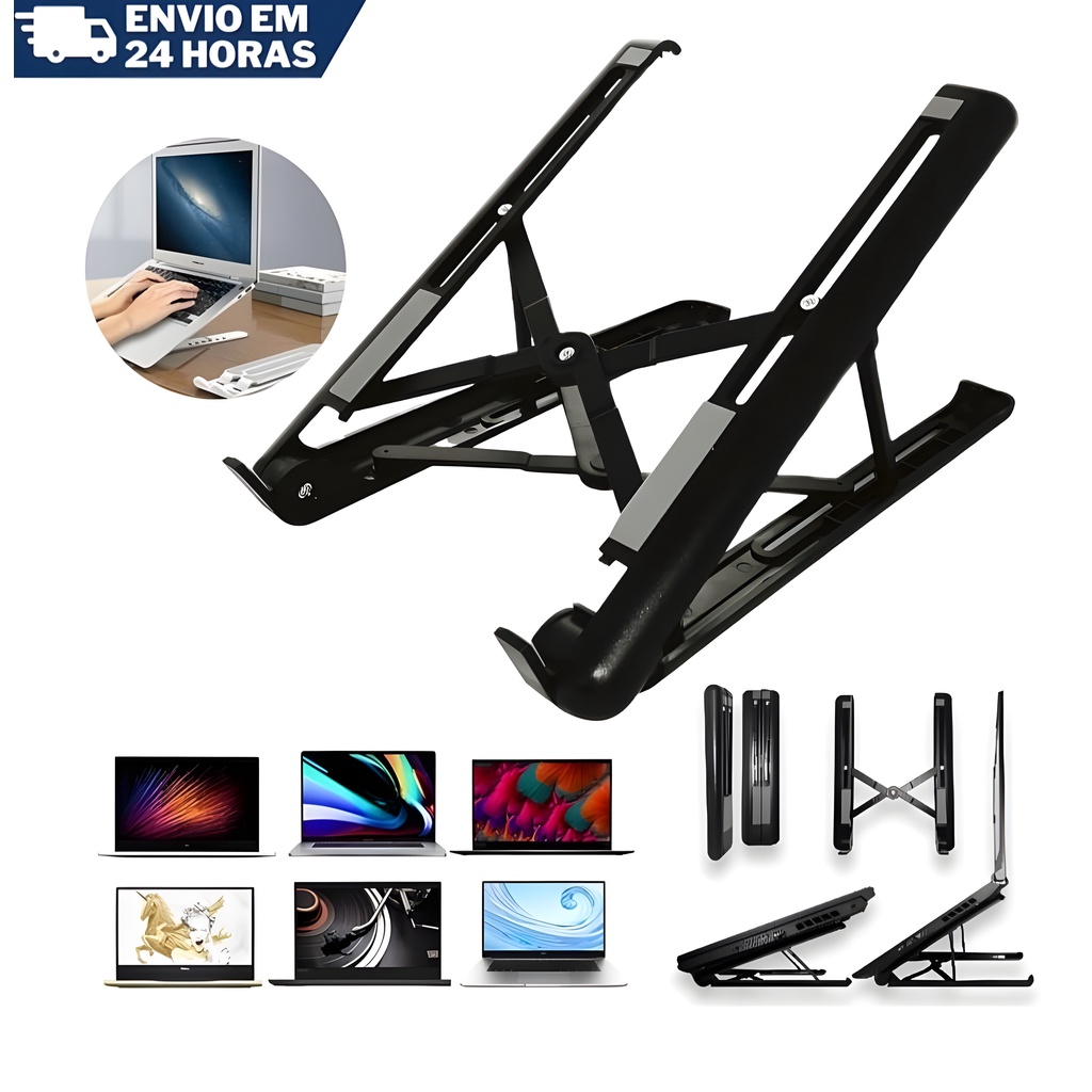 Suporte Base Para Notebook De Mesa Universal E Tablet Dobrável Ajustavel Portatil Preto Regulável Plástico ABS Reforçado Ergonômico Porta Notbook P1