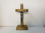 Cruz Crucifixo de Madeira com Cristo em Bronze no Tamanho de 33,5cm com Base de Mesa e Suporte pra Parede