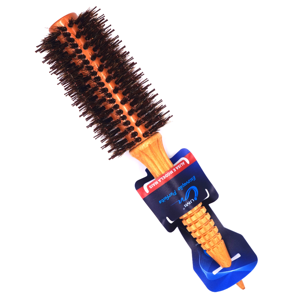 Escova Umi Redonda MIlho Para Cabelo Tamanho Médio Com Cabo de Madeira Cerdas 100% Naturais de Javali Para Escovação e Penteado de Fios.