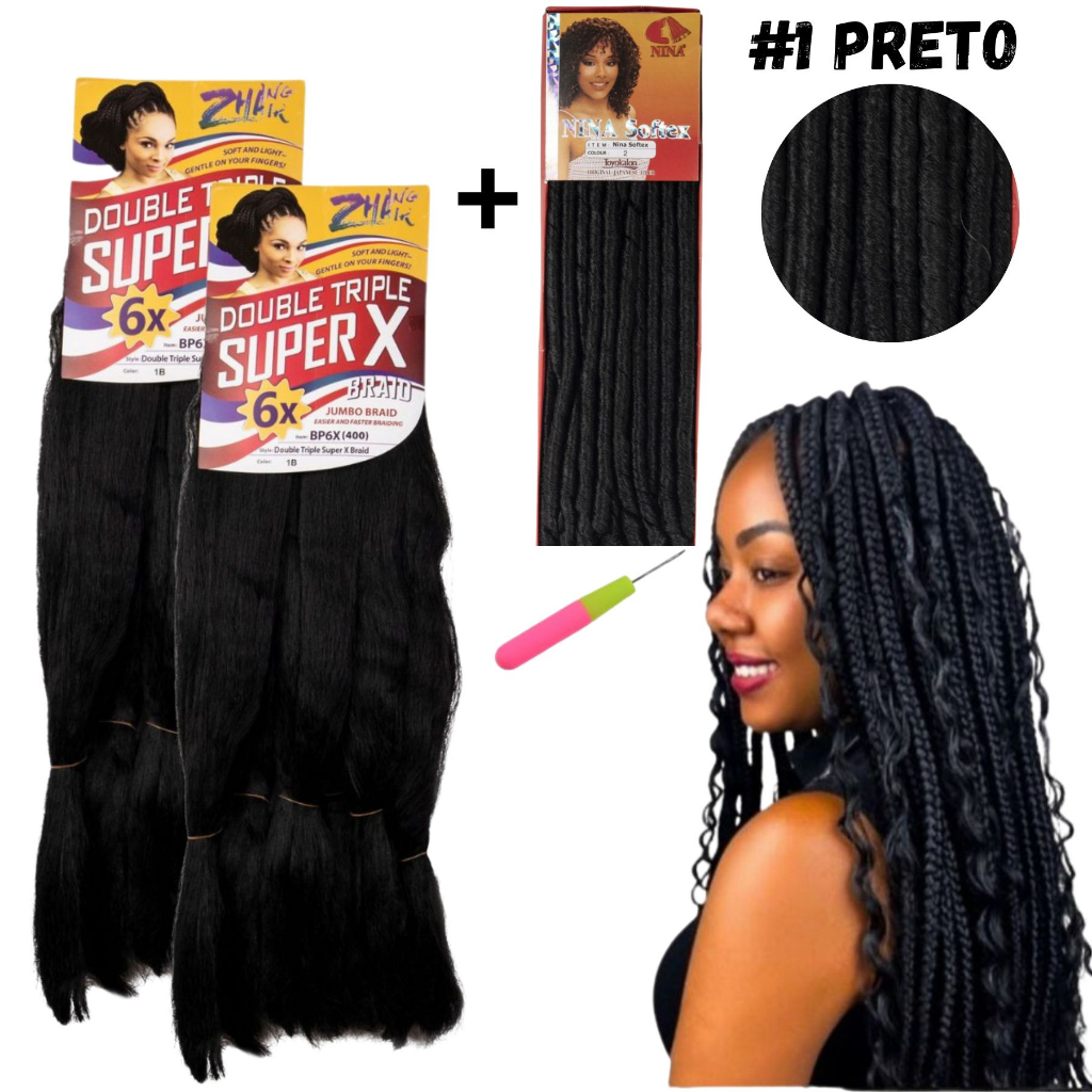 Kit 2 Cabelo Jumbo Super X + Nina Softex E Agulha Tranças Box Braids Cachos Gypsy Crochet Braids