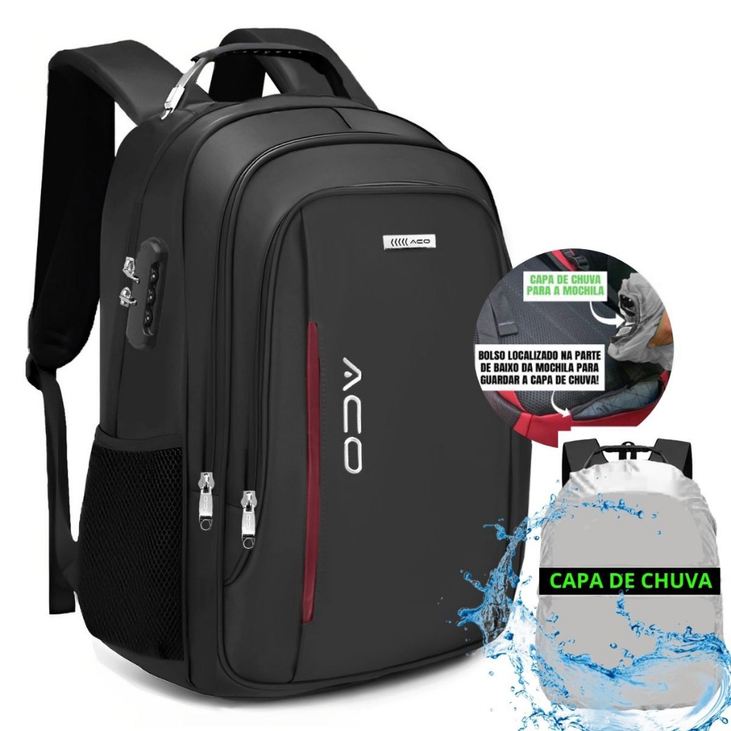 Mochila Masculina Feminina Escolar Faculdade Notebook Capa de Chuva Cadeado Saida Usb Bolso Antifurto