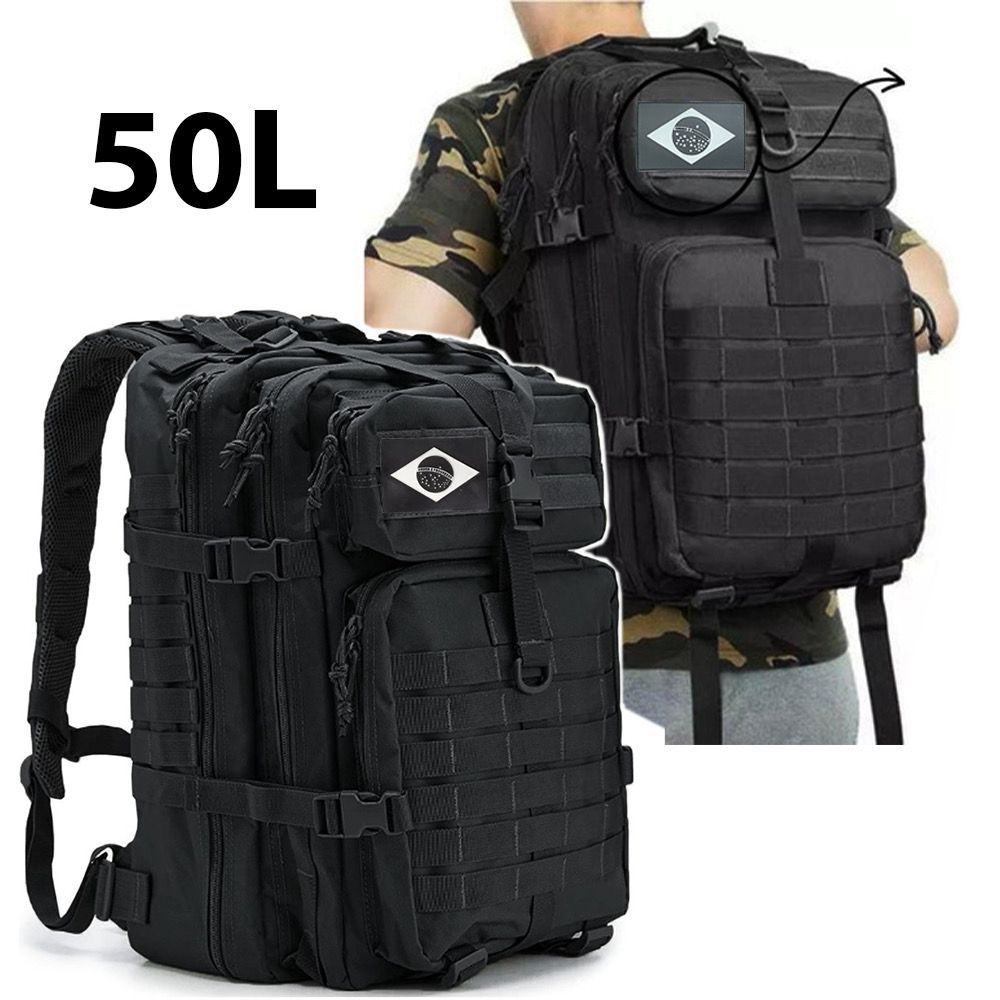 Mochila Militar Tática 50 Litros Grande Impermeável + Patch Preto Qualidade Premium