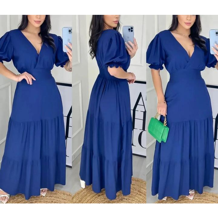 Liny Style Vestido Longo Feminino 3 Marias Decote V Manga Curta E Elástico Na Cintura Modelo Festa