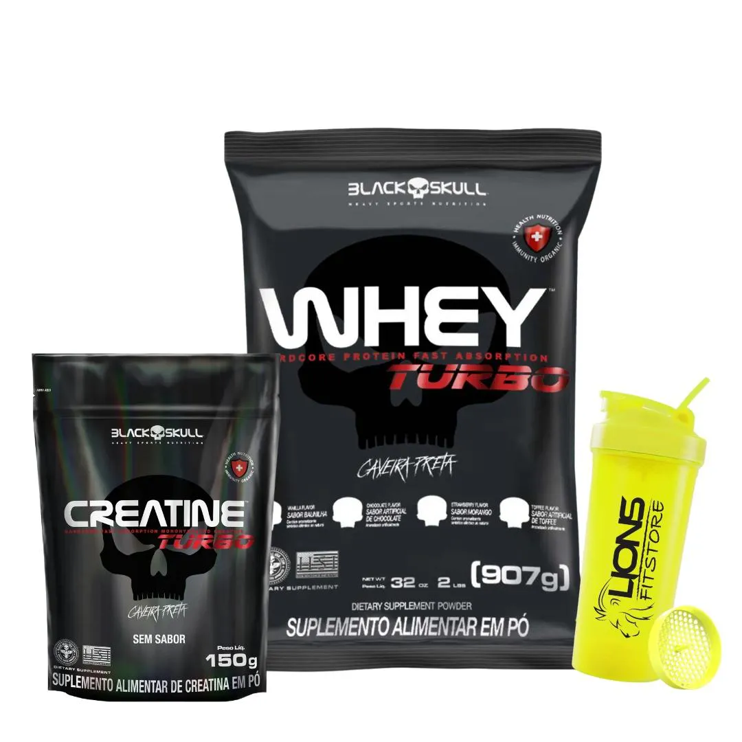 Kit Black Skull Caveira Whey Turbo Chocolate 907g + Creatine Turbo Sem Sabor 150g + Whey Bar Gourmet Cookies + Coqueteleira
