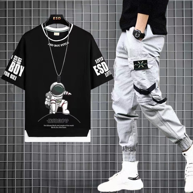 Fatos De Hip Hop Masculino Calças De Carga + Camisetas De Manga Curta Moda Conjunto Casual